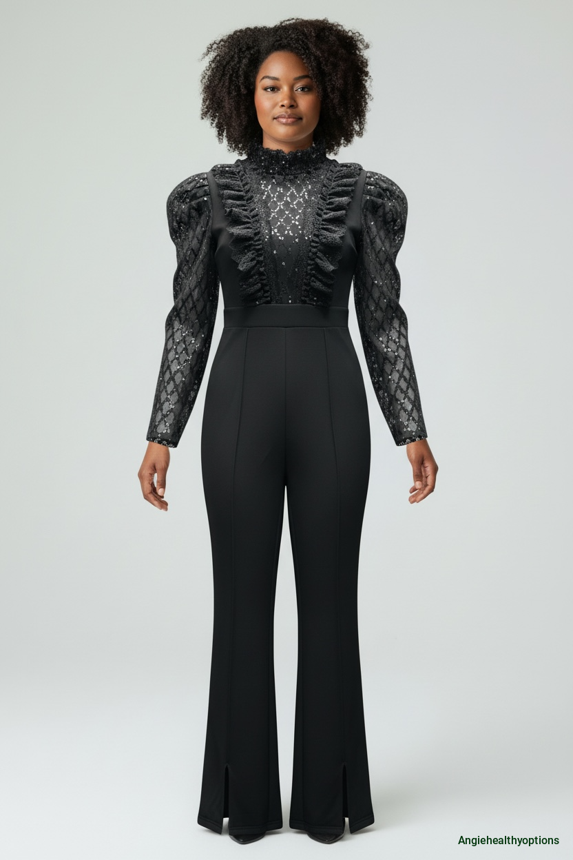 The top features a stunning all-over lace design, complete with a refined high neckline, subtly puffed sleeves, and delicate ruffle trimming that adds dimension and feminine charm. The fitted waist transitions seamlessly into sleek, tailored trouser legs with subtle front slits — creating the perfect balance of structure and movement.