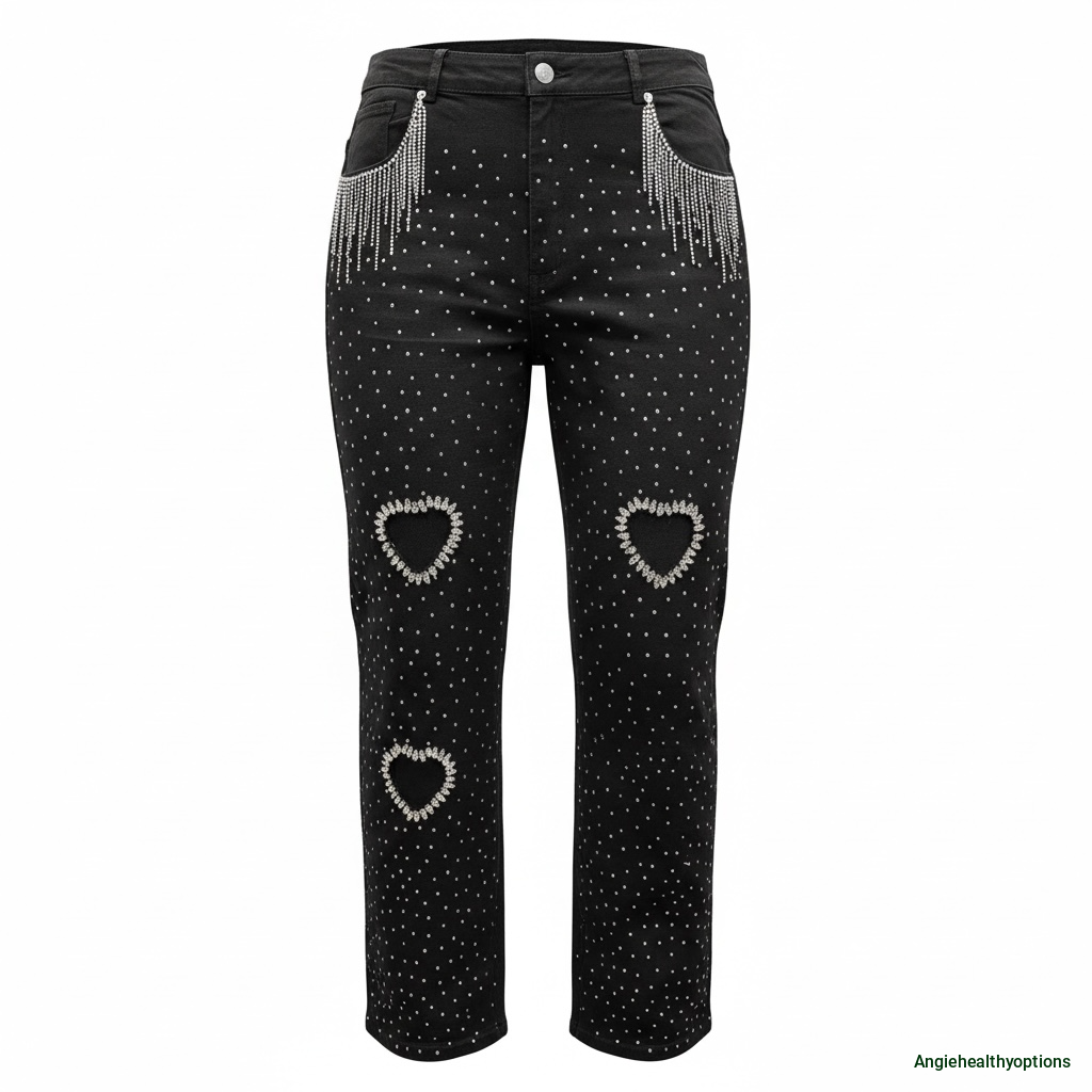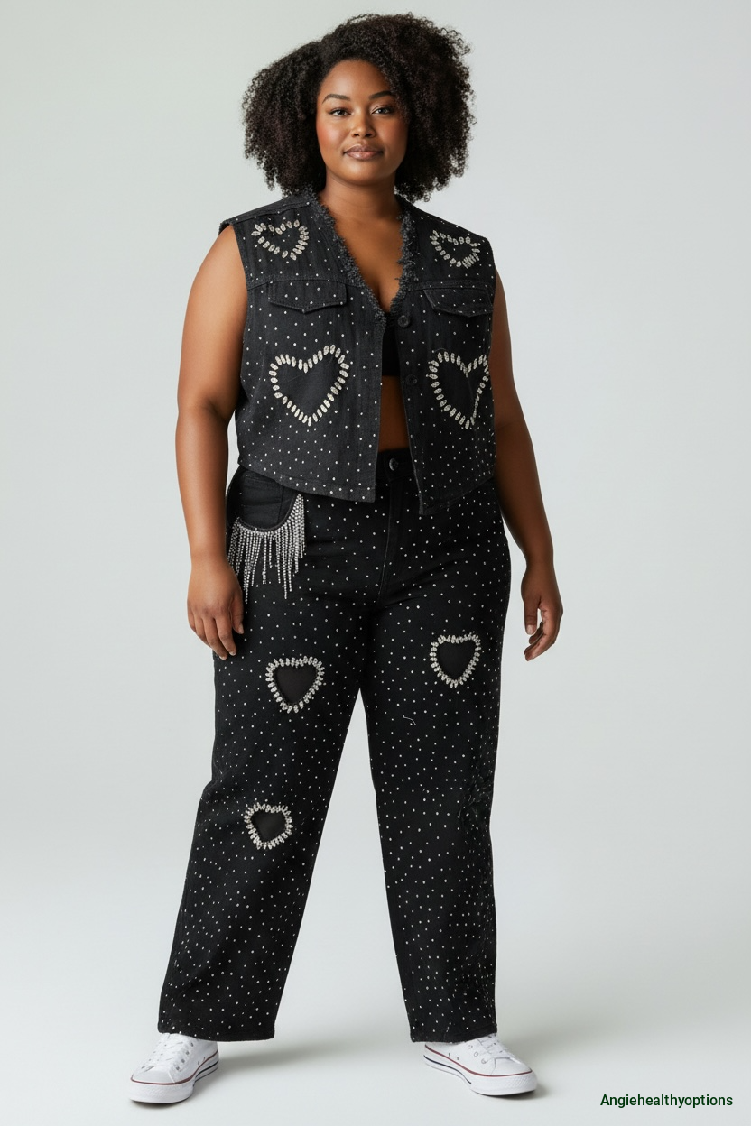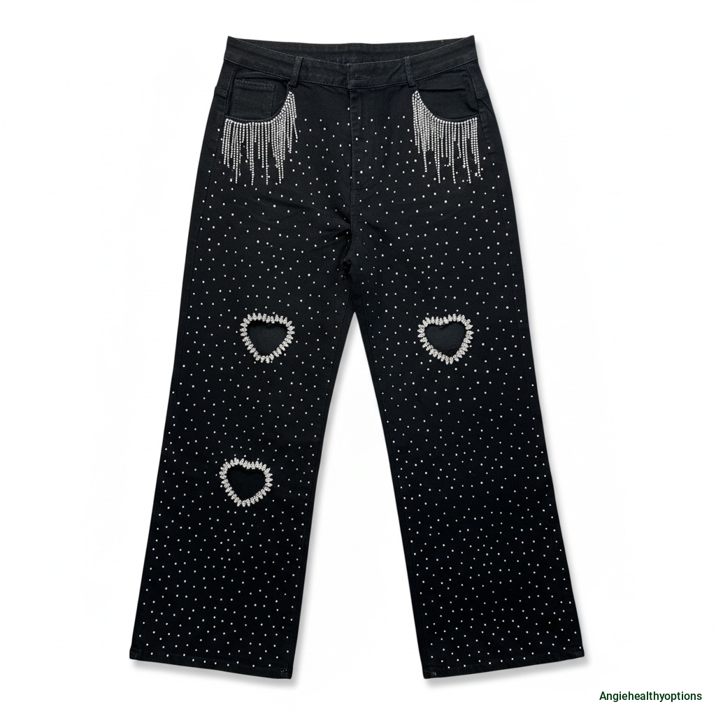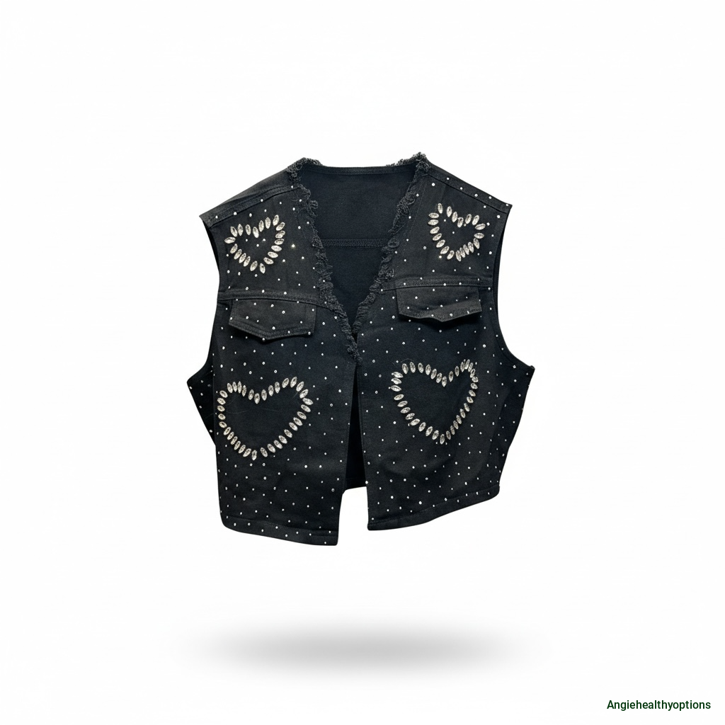 Bold, unique, and irresistibly stylish — this studded denim two-piece set delivers instant standout energy. Designed with shimmering rhinestone heart appliqués across the vest and jeans, it perfectly blends street-fashion confidence with a playful edge. Whether you’re heading to a festival, a casual night out, or creating content for social media — this look is guaranteed to turn heads. Crafted for comfort and personality, this set brings fresh attitude to your wardrobe.