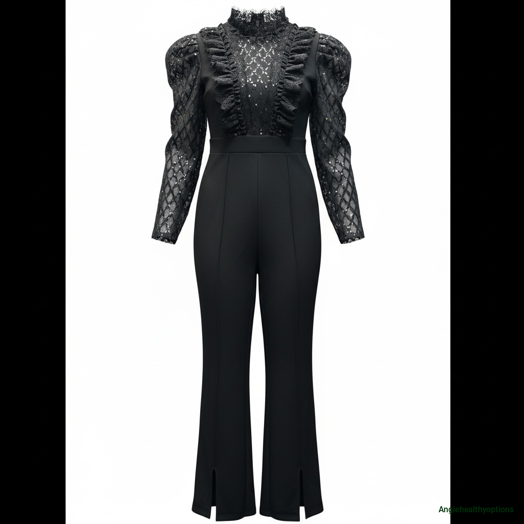 The top features a stunning all-over lace design, complete with a refined high neckline, subtly puffed sleeves, and delicate ruffle trimming that adds dimension and feminine charm. The fitted waist transitions seamlessly into sleek, tailored trouser legs with subtle front slits — creating the perfect balance of structure and movement.