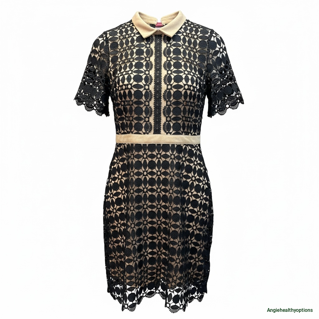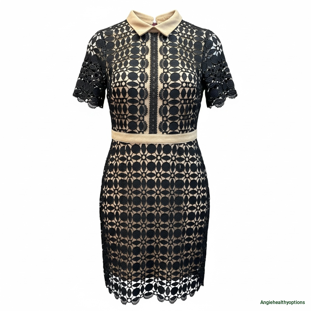Turn heads with the sophisticated charm of the Angie Style™ Elegant Lace Overlay Dress, a stunning blend of class and modern style. This short-sleeve dress features a black floral lace overlay set against a nude underlay, creating a captivating contrast that highlights the intricate detailing.