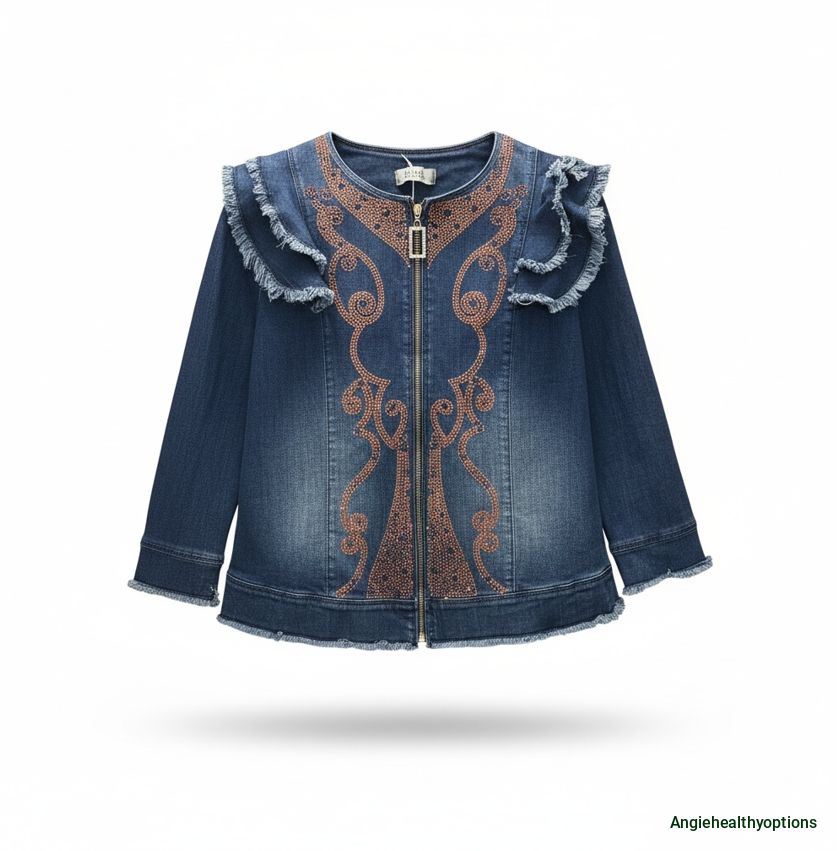 Add a touch of charm to everyday outfits with this beautifully crafted denim jacket. Designed in a classic medium-wash blue, it features intricate embroidered detailing along the front for an elegant, vintage-inspired look. Soft ruffle accents on the shoulders bring playful texture, while the frayed trim adds a trendy, modern edge. The front zipper closure ensures easy wear, and the comfortable long sleeves make it perfect for layering in cooler weather. Stylish yet versatile, this jacket pairs effortlessly with dresses, leggings, or jeans for a standout look.